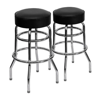 Treat the patrons of your bar, restaurant or pool hall to this superbly designed double ring barstool. The round swivel seat provides easy access and promotes conversation between customers. This commercial grade stool was built to withstand the daily rigors in the hospitality industry, but is still stylish enough for home use. The tubular footrest not only supports your feet, but acts as an additional reinforcement that helps secure the legs. This stool is also easy to clean, upholstered in a durable black vinyl cover. Add this comfortable bar height stool to your kitchen island, pub style dining table or home bar for family and friends to enjoy.