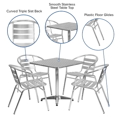 If you love hosting family and friends on your deck or need extra seating for the new dining patio of your cafe, this square table and 4 chair set is just what you need. The table’s stainless steel designer top has a smooth surface for keeping items level. The column and base are constructed of lightweight aluminum material. The lightweight chairs feature a curved triple slat back, textured seat and integrated arms. Cross braces provide extra stability when sitting and these sturdy chairs hold up to 352 lb. weight capacity. For easy storing and cleaning purposes these chairs stack up to 4 high. This set was designed for all-weather use making it a great option for indoor and outdoor settings. For longevity, care should be taken to protect from long periods of wet weather. Whether you are just starting your business, expanding your “al fresco” seating or springing for the outdoor kitchen you’ve always wanted, this set will give you the perfect look.
