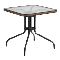 Create the perfect relaxing or entertainment environment with this patio table. This glass table will enhance your bistro, cafe, restaurant, hotel or home patio space. The ripple designed table top features a smooth surface for keeping items level. The designer rattan edge band adds an appealing touch. The table was designed for all-weather use making it a great option for indoor and outdoor settings. For longevity, care should be taken to protect from long periods of wet weather.