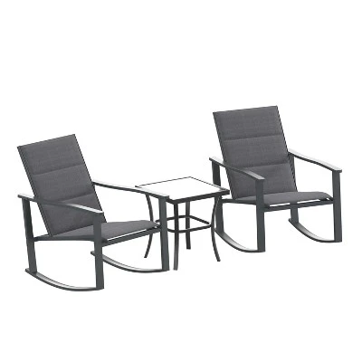 Emma And Oliver 3 Piece Outdoor Rocking Chair Patio Set With Flex Comfort Material And Metal Framed Glass Top Table