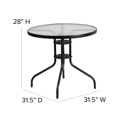 Create the perfect relaxing or entertainment environment with this patio table. This glass table will enhance your bistro, cafe, restaurant, hotel or home patio space. The ripple designed table top features a smooth surface for keeping items level. The table was designed for all-weather use making it a great option for indoor and outdoor settings. For longevity, care should be taken to protect from long periods of wet weather. A black powder coat finish lends the round-shaped table a bold, versatile appearance that matches well with your favorite chairs.