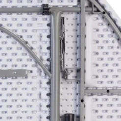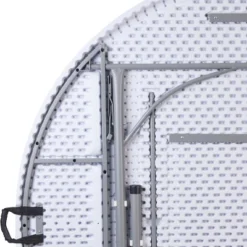 Plan your next wedding, baby shower, quinceañera and catering event around this spacious 71″ round bi-fold granite white plastic banquet and event folding table. Place decorated banquet tables in your event hall to display options to potential clients or these portable folding tables can be brought to the party location. The table folds in half and includes a carrying handle to better grip the table during transport. If you regularly entertain in your home this easy to clean plastic table comes in handy to seat an additional 10 people. Pull out this 6 foot folding table to host game night, craft parties and holiday celebrations. This temporary foldable table has gray powder coated legs that lock underneath the top for flat storage in the garage or storage closet. This ready to use commercial grade folding table is ideal in banquet halls, convention halls, recreation centers, schools and meeting event spaces. Perfect to entertain on for outdoor events the table must be stored indoors to protect the frame from extreme moisture. Additional Features: Folds in half for storage and travel, Includes convenient carrying handle, Gray Powder Coated Locking Legs with protective floor caps, Folded Size: 4″W x 70.75″D x 35.5″H