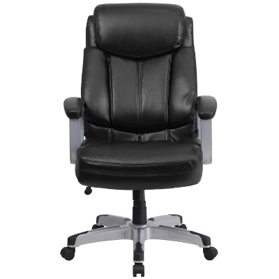 Finding a comfortable chair is essential when sitting for long periods at a time. Big & Tall office chairs are designed to accommodate larger and taller body types. This chair has been tested to hold a capacity of up to 500 lbs., offering a broader seat and back width. Covered in black LeatherSoft upholstery, this chair will lend sophistication to your workspace. Leather soft is leather and polyurethane for softness and durability. The tilt lock mechanism rocks/tilts the chair and locks in an upright position while the tilt tension adjustment knob adjusts the chair’s backward tilt resistance. High back office chairs have backs extending to the upper back for greater support. The high back design relieves tension in the lower back, preventing long term strain. This office chair features plenty of thick padding to provide greater support. The waterfall front seat edge removes pressure from the lower legs and improves circulation. Chair easily swivels 360 degrees to get the maximum use of your workspace. The pneumatic adjustment lever will allow you to easily adjust the seat to your desired height. The silver nylon capped metal base with black caps prevents feet from slipping when resting on chairs base.