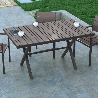 Create a first-rate dining experience at your restaurant or in the backyard with updated commercial grade dining tables. Designed for use in the hospitality industry, as well as your busy household this attractive outdoor dining table features poly resin slats that mimic the look of wood without the maintenance atop an X shaped base. UV treated to prevent fading this patio table will look great season after season. Rust resistant powder coating covers the sturdy welded metal frame capable of holding up to 300 lbs. static weight with seating for up to 6 adults. The lightweight design allows for easy storage and nightly cleanup. Use this table in your kitchen or dining room without worry, the fixed floor glides will protect your indoor flooring. Assembly takes less than 10 minutes and this dining table wipes clean with a damp cloth for quick seating turnaround.