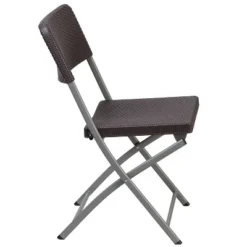 Add some pizzazz to your residential or commercial space with this stylish folding chair. This plastic chair has a woven rattan design throughout that offers an appealing look and is suitable for indoor or outdoor use. The durable steel tubular frame, double support braces and textured seat ensure safety while seated and make this an ideal event chair. Protective floor caps prevent your flooring from being marred when the chairs are moved. These chairs are portable and fold to transport and store.