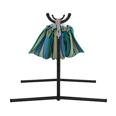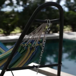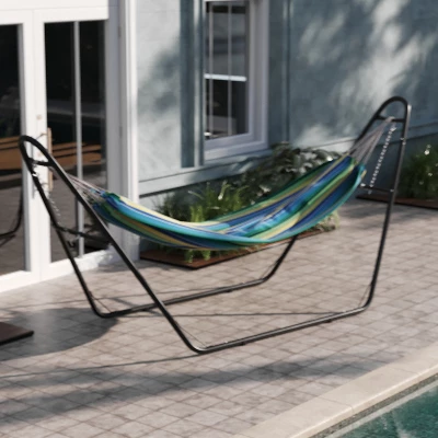 Get vacation vibes without leaving home with this 2 person hammock with heavy duty stand. Whether you want to hang out indoors or outside, the portable stand lets you choose where you want to relax. Snuggle up with your little one, significant other, or enjoy some solo time enfolded in total comfort. Powder coated for year-round use, the freestanding steel frame holds up to 450 lbs. static weight and has 6 holes so you can adjust the hanging height of your hammock for a custom fit. The premium poly-cotton blended hammock is tightly woven to be super supportive and durable. Getting away for vacation or a long weekend? The stand assembles with no tools required and fits easily into the included carry bag so you can take your hammock and stand along. Your new favorite seat wipes clean easily with a damp cloth to maintain its looks season after season.