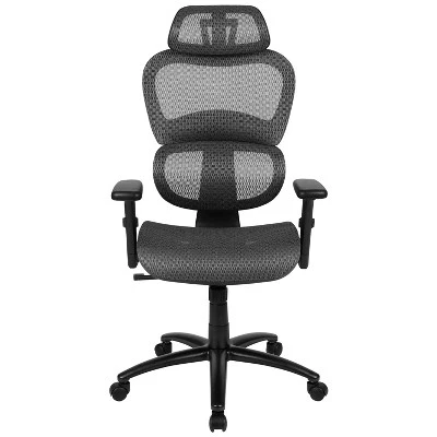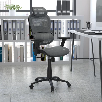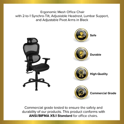 Transform your basic office chair into something outstanding by replacing it with this ergonomic mesh office chair brimming with comfort. Structured with a deep curved seat, a stylish curved back and arm pads that pivot inward and outward this desk chair is designed for support. Mesh office chairs offer ventilated airflow during summer months and days when demands are high. Working in an office environment can take a toll on your posture if not properly supported which can lead to poor productivity. What makes this office chair unique and ergonomic is the synchro-tilt where the back and seat recline at a 2-to-1 ratio respectively, keeping the seat closer to the floor as you recline. Having your feet remain level on the floor while reclining puts you in a more relaxed position. The chair locks in 3 positions to lock in your reclined and working positions, adjust the rocking motion by turning the knob underneath the seat. The mesh back swivel ergonomic task office chair will exceed your needs in comfort and style. The curved backrest is not just for good looks but offers incredible lumbar support as you recline back during phone meetings and intermittent breaks while the pivot headrest can be adjusted incrementally. With functions to get you through any task you’ll enjoy this chair as your home office chair or professional office chair.