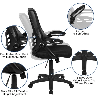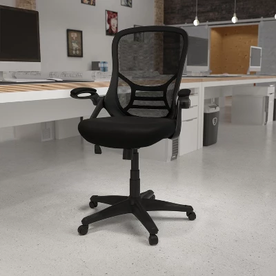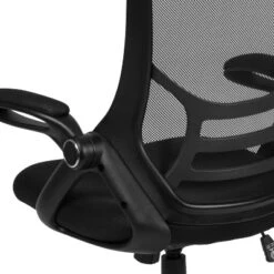 Fall into comfort on this ultra-padded swivel office chair that’ll add personality to your home office or professional office space. Put that old chair to rest, having the support of an ergonomic office chair will help improve your attitude when you no longer must sit in discomfort. This modern office chair is equipped with a lever to control the seat height and activates the seat recline. Mesh office chairs are popular due to their ventilated mesh material that allow air to circulate to your back, keeping you cool and calm. Paired with a contoured padded seat with pressure relieving waterfall edge and a high back this executive office chair will integrate into any space. If you like working with your chair raised high a flip-up arm chair is perfect allowing you to flip the arms upward like an armless chair while pulling yourself close to your desk. You’ll have no problem taking charge of your workday perched on this high back ergonomic office chair with flip-up arms. You’ll wish you had purchased this chair sooner, whether as a personal purchase or to accommodate your entire staff. Additional Features: Waterfall Seat reduces pressure on your legs, Contoured Mesh Upholstered Seat with CAL 117 Fire Retardant Foam, Pneumatic Seat Height Adjustment, 5-Star Nylon Base with Dual-Wheel Casters