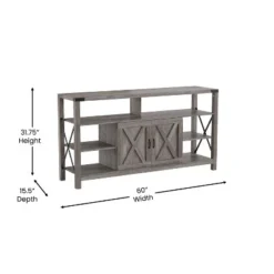 Organize your media and display your favorite dĂ©cor pieces with this 60″ wide rustic modern farmhouse TV stand. Durably constructed from engineered wood with a smooth laminate finish for style and strength. Steel corners, joint brackets and X details along the sides give a rustic look and additional strength and durability to this media console. Ample storage is available with five open storage shelves and an additional closed storage compartment with shelving. Never run out of space for all of your favorite movies and always be ready for a marathon binge session. Each shelf can support up to 25 lbs. of static weight and a cable management hole in the back keeps all of your cords neat and organized. The assembly can be completed in 60 minutes or less with the included instructions and hardware and the TV stand easily wipes clean with a damp cloth for hassle free upkeep.