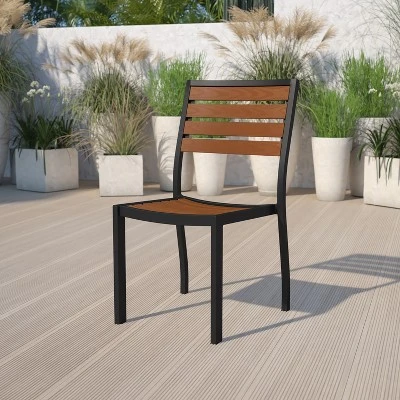Create the perfect space for relaxing evenings and great conversations with this faux teak outdoor patio chair. This comfy patio chair boasts a slatted poly back and seat and lightweight aluminum frame capable of holding up to 300 lbs. weight capacity to accommodate most visitors. This patio dining chair is weather and rust resistant so you won’t need to move it or put it away when the seasons change. Best of all, this chair comes fully assembled so you can start enjoying it as soon as you receive it. Create a sophisticated look for your outdoor space with this slatted patio chair that pairs nicely with our outdoor table with faux teak poly slats. Fixed plastic floor glides will allow ease of movement and spills clean up easily with a water based cleaner making this chair very low maintenance. Reduce stress and make the most of your evenings and weekends with this patio dining chair that is sure to become your go-to seat. Additional Features: Lightweight Black Powder Coated Aluminum Frame with Protective Floor Glides, Back Size: 18.75″W x 18″H; Seat Size: 16″W x 18″D x 17″H, Chair Ships Fully Assembled and Ready to Use, Complete the look with our outdoor patio bistro dining table with faux teak poly slats