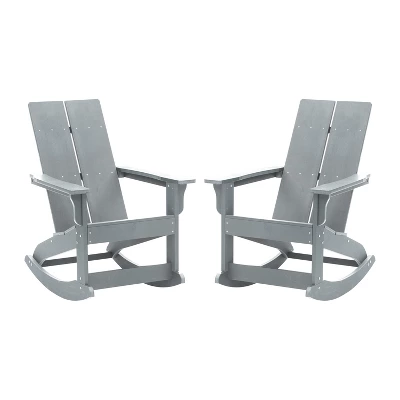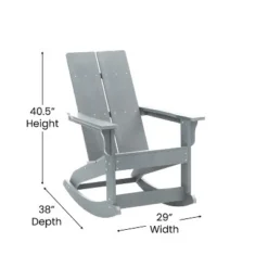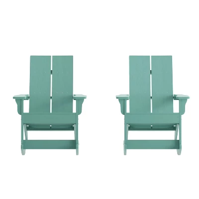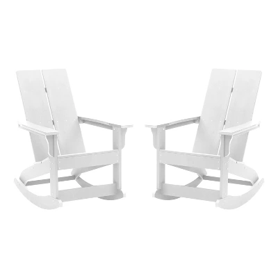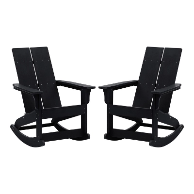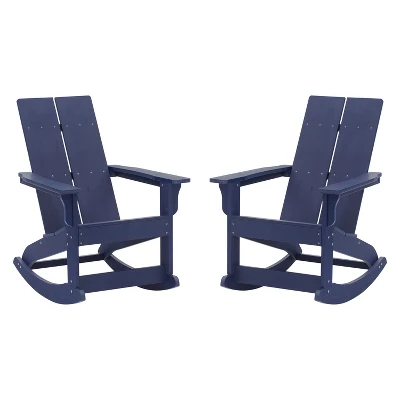 Create a comfortable seating arrangement on your deck, porch or patio with this set of two all-weather chairs, a modern twist on the classic adirondack chair with rocking legs for a relaxing experience. Sit outside on a warm summer night or enjoy a cozy fire on a crisp fall day with friends without worry. The poly resin construction of this chair offers premium weather resistance against rain and snow and ensures that the chair will not crack, splinter or chip while a durable UV resistant coating makes the vibrant navy color resistant to fading . All of the hardware is rust resistant stainless steel for lasting durability. A 350 lb. weight capacity and easy assembly make this the ideal chair for any users. This chair cleans easily with water and a dry cloth for easy maintenance.