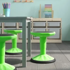 Do you have little ones who love to wiggle during meals and learning activities? This active motion stool offers kids a fun way to release pent up energy. A rubberized seat with pneumatic height adjustment feature allows the stool to go from ?” to ?” to suit your children as they grow. The bottom is covered with non-slip rubber for added safety and peace of mind. With 360 degrees of 5-10° tilt, your little one can rock, swivel and tilt in any direction. Children should keep their feet on the floor and be under adult supervision to prevent tipping while in use. These active motion stools strengthen your child’s core, promote good posture and help with concentration. Available in several colors, you are sure to find a stool your children will love. The lightweight design with handles makes for easy transport to grandparents’ homes or anywhere you may need it.
