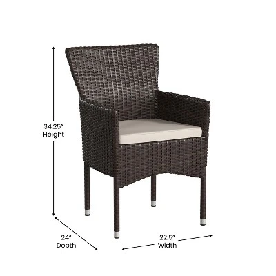 Update your porch, patio, deck or sunroom with this set of four woven patio chairs. The modern design is beautifully accentuated by the black finished woven rattan wicker. The durable, powder coated steel frame features welded joint construction for dependable strength and is weather and rust resistant for longevity, making it perfect for use outdoors. The 350 lb. weight capacity gives you peace of mind knowing all of your guests will have safe seating. A removable gray cushion adds padded comfort to the deep seat and plastic glides protect your flooring surfaces from damage when used indoors. Your chairs ship preassembled and ready for use and wipe clean with a damp cloth.
