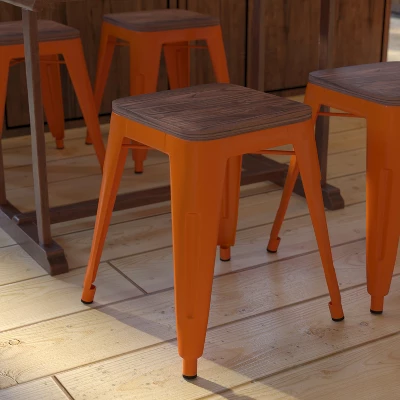 Give your kitchen or dining room an instant refresh with this set of 4 indoor metal table height stools. Choose from several colors to match any decor. With a streamlined silhouette and wooden seat, this versatile bar stool can tuck under your dining room table to open up floor space, ideal for small spaces such breakfast nooks, apartments or condos. The backless design doesn’t obstruct the view of your room creating more visual space. Featuring welded construction with under seat bracing and crafted from 1 inch thick iron, this table stool will be a long-lasting addition to any space. Fixed rubber floor glides prevent damage to your hard flooring surfaces. When not in use, stools stack up to 10 high for easy storage. Simply wipe clean with water followed by a dry cloth to maintain your stool. The stools arrive assembled, just attach the wooden seat.